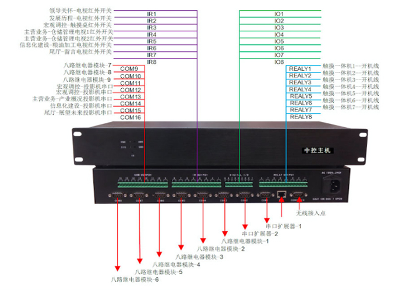 7.C語言中控主機(jī):大量的控制接口,8路弱電繼電器控制(可擴(kuò)展),8路紅外控制輸出(可擴(kuò)展),8路IO探測控制(可擴(kuò)展),16路RS232(可擴(kuò)展),4個(gè)RS485(可擴(kuò)展),支持多臺(tái)網(wǎng)絡(luò)中控主機(jī)互聯(lián)互通、本地控制、遠(yuǎn)程控制,遠(yuǎn)超一般中控。